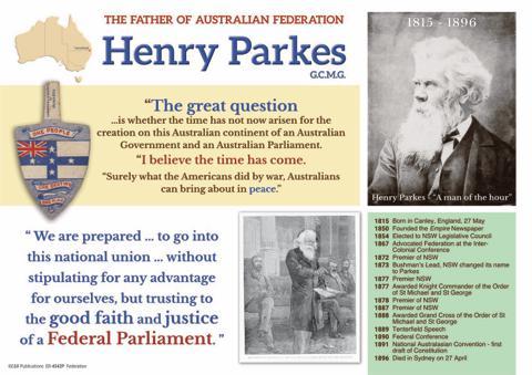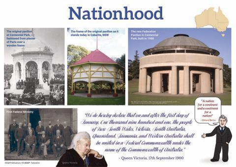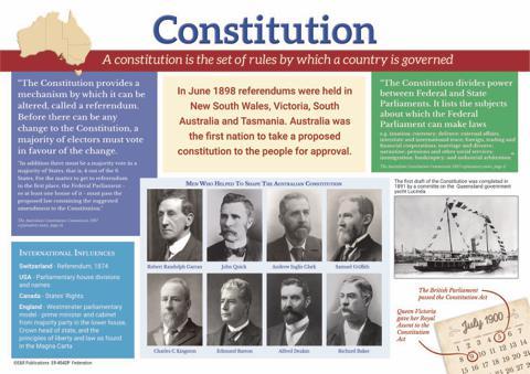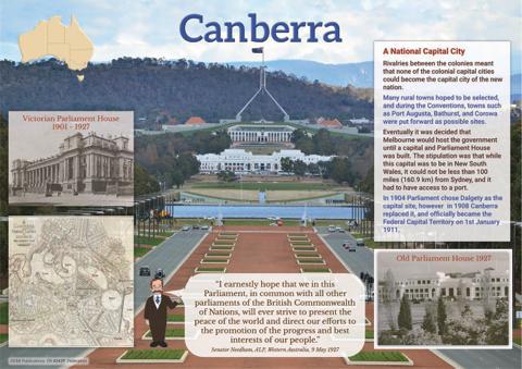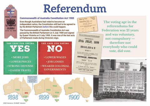 Set of 8 x A3 digital posters exploring the political foundations of Australia. Includes federation pavilions, conference conventions, the Constitution, Henry Parkes, nationhood, reasons for Federation, referendums, and Canberra. Each poster has 2 blackline master pages on the reverse side - 16 in total.